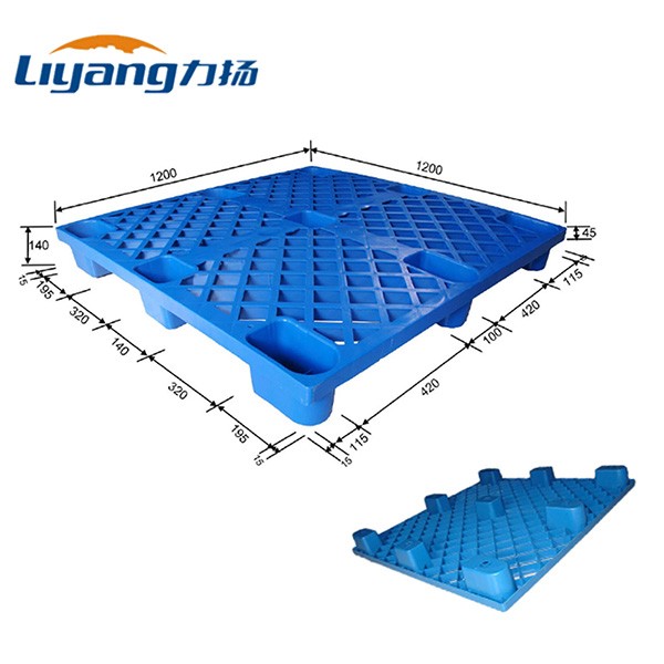 Out Size 1200mm×1100mm×140mm Material HDPE Weight 9 KG Color Customized Rating Load Static Load 1200 KG Dynamic Load 500 KG Rack Load X Operating Temperature (+50~-30)℃ Logo Customized Printing Craft Molding Silk-screen Printing Structure Design Top Grid Surface Bottom Nine feet Molding Method One Piece Injection Molding Fork Entry Way 4-way Entry Fork Opening Size 365*95&315*95mm FCL 860 Pieces/ 40 HC -