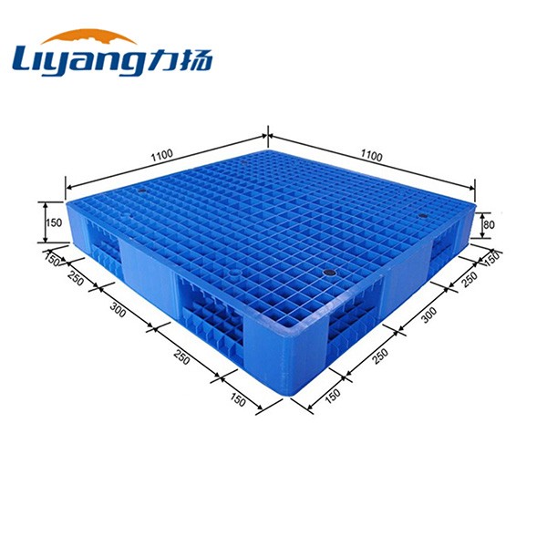 Out Size 1100*1100*150mm Material HDPE Weight 18.5 KGS Color Blue/ Customized Type Euro Pallet Certificate CE/SGS/ISO9001 Feature Eco-friendly Pallet Rating Load Static Load 6000 KG Dynamic Load 1200 KG Rack Load 700 KG Operating Temperature (-30~+70)℃ Logo LiYang Structure Design Top Full Grid Bottom Full Grid Molding Method One piece injection mold Fork Entry Way 4-way Entry Fork Opening Size 270x80mm FCL 365 Pieces/ 40 HC -