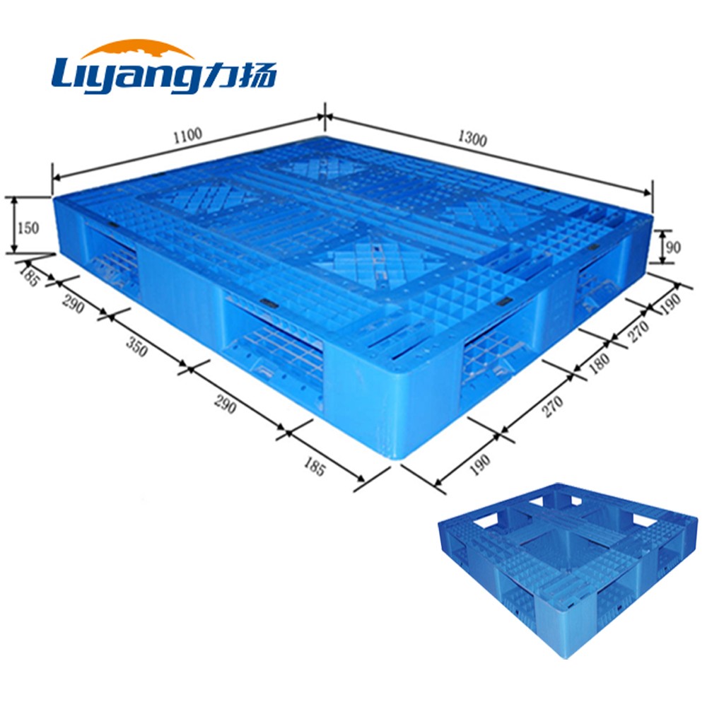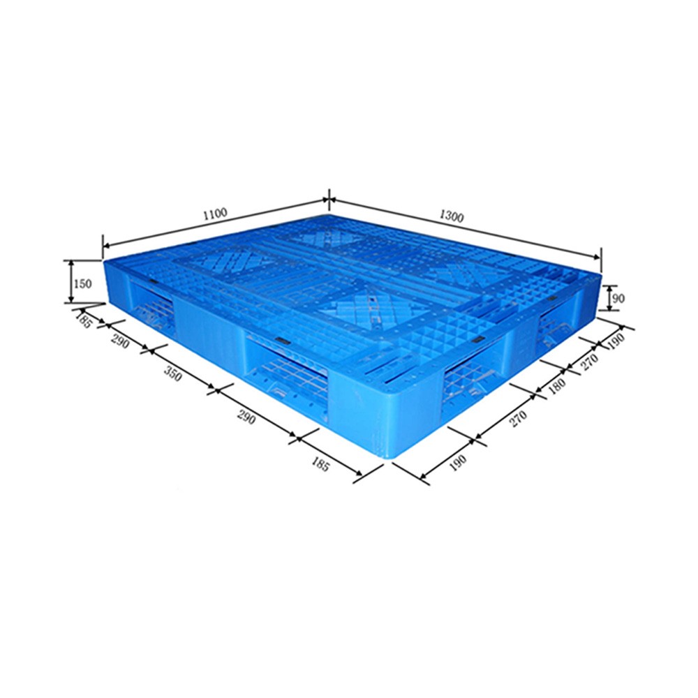 Out Size 1300mm×1100mm×150mm Material HDPE Weight 20.5KG Color Customized Rating Load Static Load 4000 KG Dynamic Load 1000 KG Rack Load 400 KG Operating Temperature (+50~-30)℃ Logo Customized Printing Craft Molding Silk-screen Printing Structure Design Top Grid Surface Bottom Grid Surface Molding Method Injection Molding Fork Entry Way 4-way Entry Fork Opening Size 270x90mm 290x90mm FCL 305Pieces/ 40 HC -
