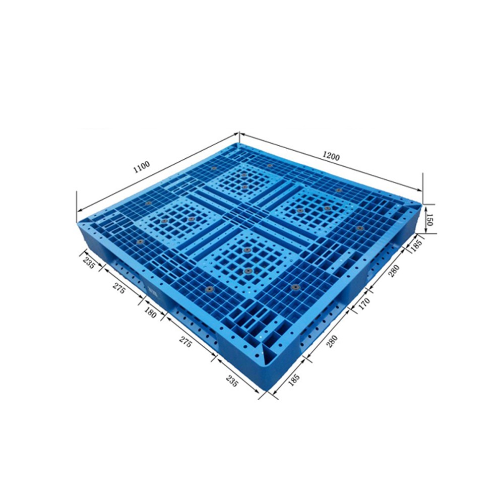 Out Size 1200mm×1100mm×150mm Material HDPE Weight 20KG Color Customized Rating Load Static Load 5000 KG Dynamic Load 1500 KG Rack Load 500 KG Operating Temperature (+50~-30)℃ Logo Customized Printing Craft Molding Silk-screen Printing Structure Design Top Grid Surface Bottom Grid Surface Molding Method Injection Molding Fork Entry Way 4-way Entry Fork Opening Size 280x90mm FCL 340Pieces/ 40 HC -