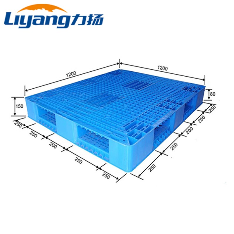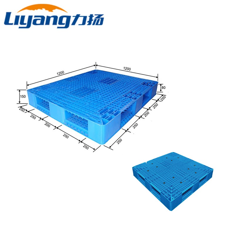 Out Size 1200*1200*150mm Material HDPE Weight 22.7 KGS Color Blue/ Customized Type Euro Pallet Certificate CE/SGS/ISO9001 Feature Eco-friendly Pallet Rating Load Static Load 6000 KG Dynamic Load 1500 KG Rack Load 800 KG Operating Temperature (-30~+70)℃ Logo LiYang Structure Design Top Full Grid Bottom Full Grid Molding Method One piece injection mold Fork Entry Way 4-way Entry Fork Opening Size 250x80mm FCL 310 Pieces/ 40 HC -