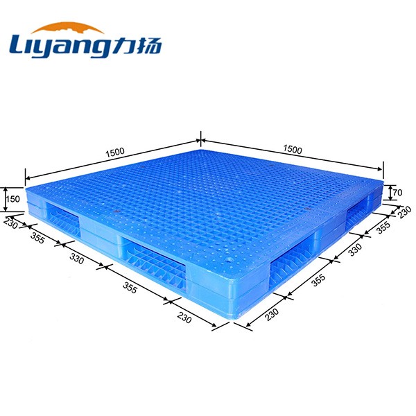Out Size 1500*1500*150mm Material HDPE Weight 46 KGS Color Blue/ Customized Type Euro Pallet Certificate CE/SGS/ISO9001 Feature Eco-friendly Pallet Rating Load Static Load 10000 KG Dynamic Load 1800 KG Rack Load 1000 KG Operating Temperature (-30~+70)℃ Logo LiYang Structure Design Top Full Grid Bottom Full Grid Molding Method Welded Fork Entry Way 4-way Entry Fork Opening Size 355x70mm FCL 162 Pieces/ 40 HC -